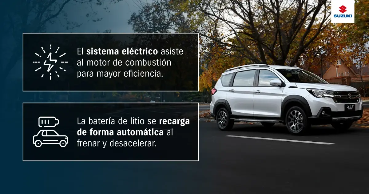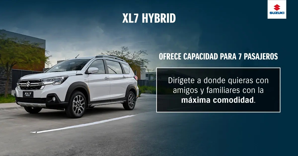 Con el XL7 Hybrid de Suzuki las familias grandes no tienen excusas para no apostar por un auto hÃbrido. Este ejemplar permite que hasta 7 personas se trasladen con total comodidad . Además de su gran espacio interior, este modelo se caracteriza por su gran eficiencia gracias al sistema Start-Stop , que apaga automáticamente el motor del vehÃculo al detenerse para ahorrar combustible.