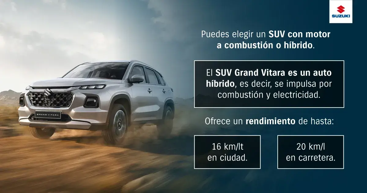 Quienes hayan hecho de la sostenibilidad y el cuidado del planeta una forma de vida, pueden potenciar su conciencia medioambiental con Grand Vitara Hybrid . Este moderno y elegante auto integra un motor hÃbrido , es decir, se impulsa a través de combustible y electricidad. También cuenta con una tracción 4WD y tecnologÃa All Grip en su versión Limited at 4x4 .