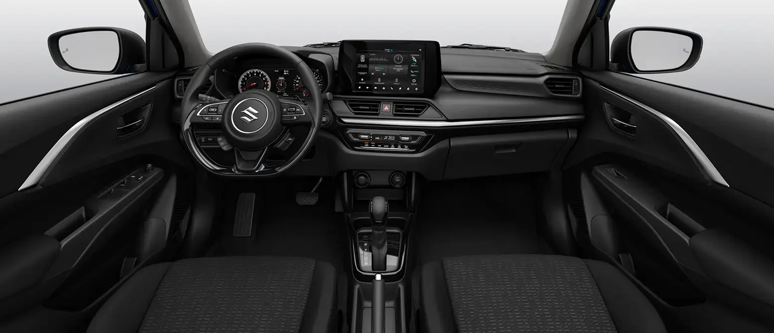 Vista del habitáculo del Suzuki New Swift Híbrido, mostrando un diseño minimalista y tecnológico.