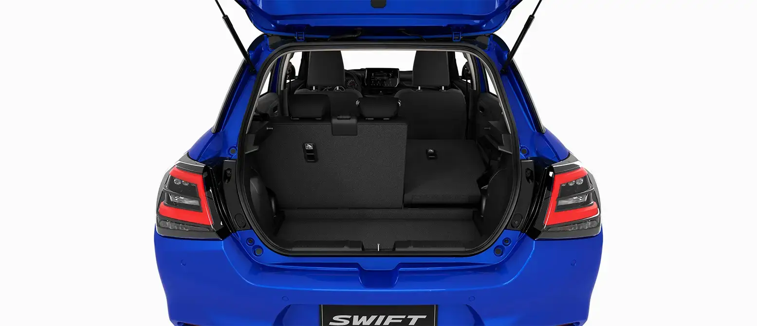 Amplio maletero de hasta 580lts del Suzuki New Swift Híbrido con los asientos traseros abatidos.