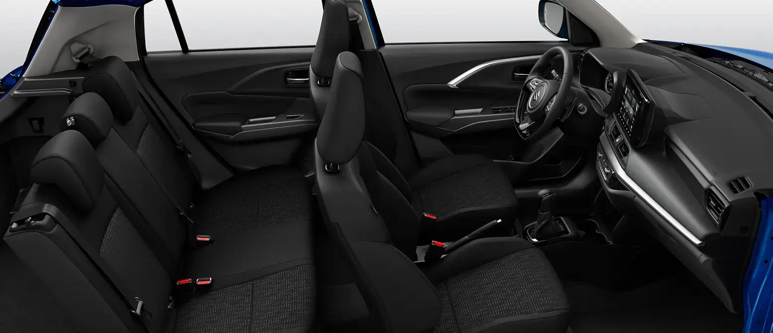 Interior del Suzuki New Swift Híbrido mostrando su diseño y asientos de tela en color negro.